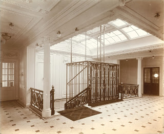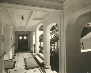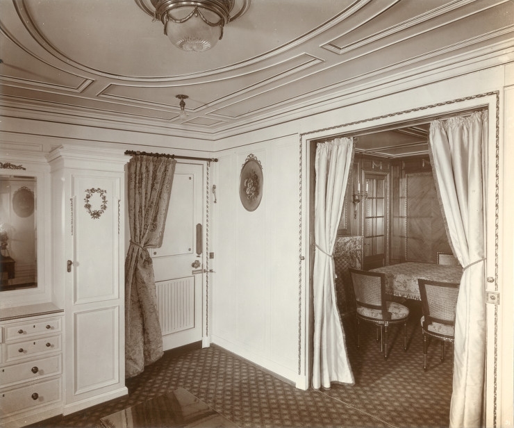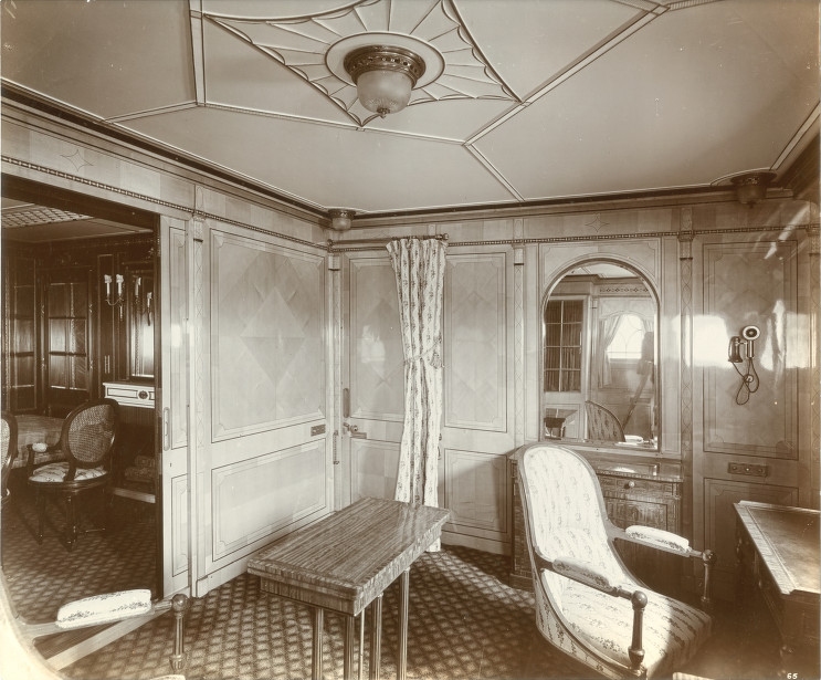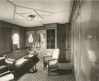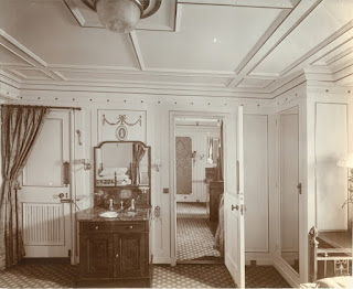 Some views of the two first class regal suites. These came with such astonishing amenities as separate bedrooms, a sitting room/parlor, a private dining room, a trunk room and room (probably closet sized) for one's personal servants. And the ultimate in sea going luxury for which one would pay out the nose... a private en suite water closet and bathroom. Prior to the Second World War private bathrooms were a rare, and expensive luxury at sea. Even millionaires typically had to put on their slippers and bathrobe when nature called in the middle of the night and hoof it down the hall. Those wishing to take a bath would first have to make an appointment with the ship's bath steward. These rooms also had sinks with both hot and cold running water. Most staterooms had only cold water. Hot water for shaving or washing up was delivered at appointed times, usually in the morning and when the dressing gong was sounded for dinner. It could also be requested at anytime via your cabin steward.