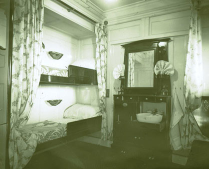 Third class cabin. Contrary to popular belief it was the third class or "steerage" who provided the profit for the big steamship companies in the pre-war years. They required the least service and the fewest amenities and could be packed in to much more cramped spaces. On the Lusitania the third class cabins were generally quite spartan but still liveable. There were no dormitory style steerage quarters. All third class passengers had cabins which had between two and six berths. Each cabin had a sink with running water. As in the second class, you could pretty much guarantee that you were going to have roommates. Also there were no "bath" facilities on most ships for the third class though Lusitania did have generally decent lavatory and washrooms.